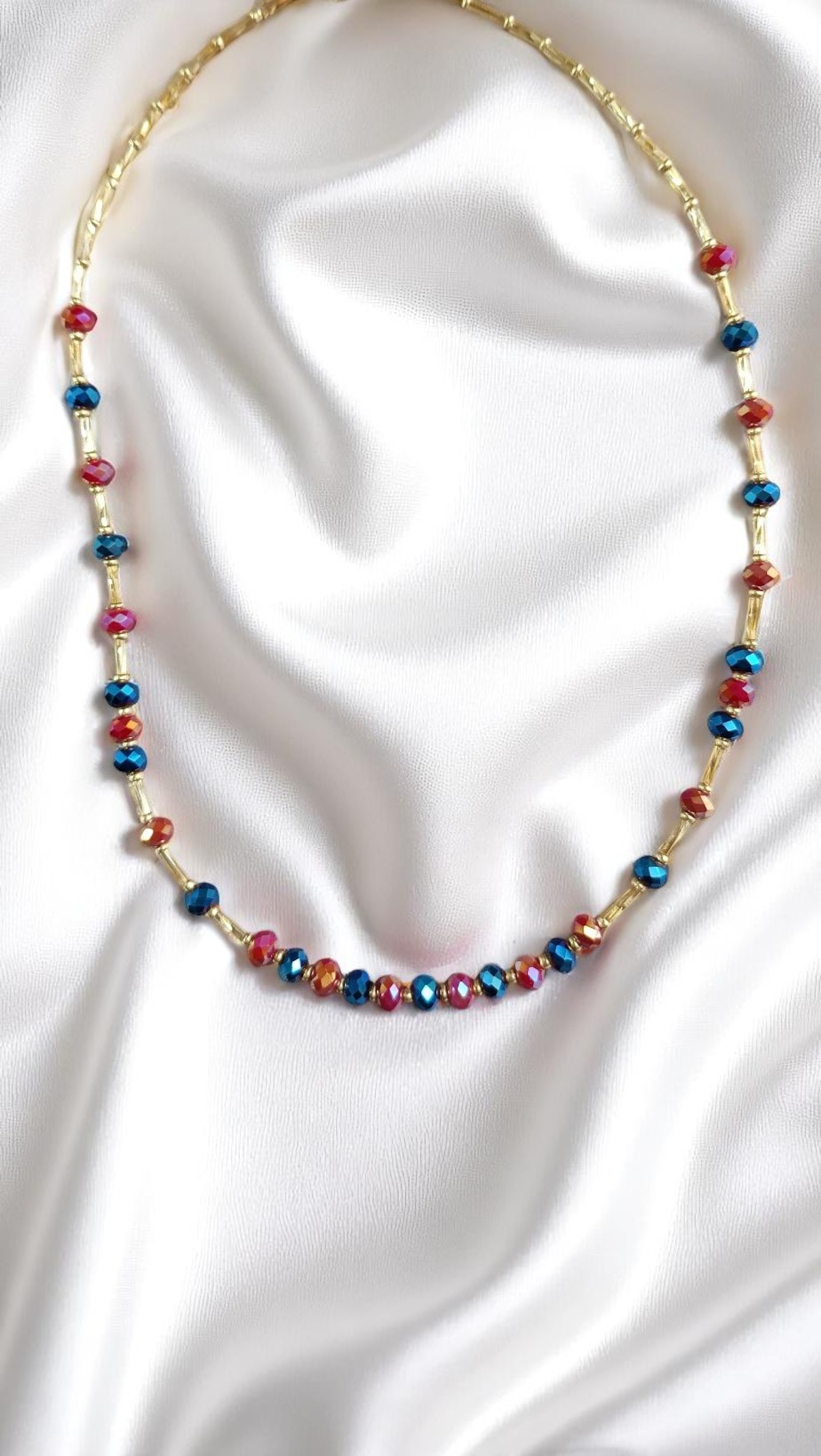 Φλόγες από κόκκινο, μπλε, χρυσό και μαύρο στροβιλίζονται σε αυτό το ζωντανό κολιέ που φέρει τη λάμψη ενός πολύχρωμου καρναβαλιού. Ιδανικό για την ψυχή που αναζητά τη γιορτή σε κάθε στιγμή της ημέρας.