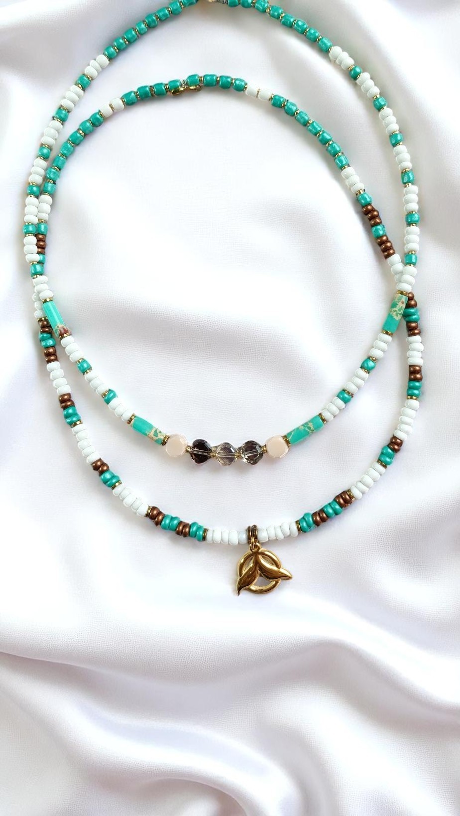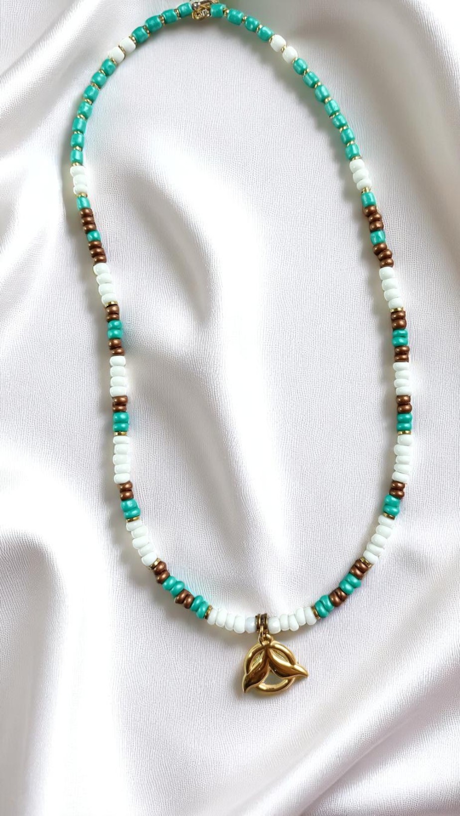 Σαν να ξεβράστηκε από τη μυστική ακτή μιας γοργόνας, αυτό το κολιέ θυμίζει τις αποχρώσεις της ουράς της – βαθύ τιρκουάζ, έντονο κόκκινο και απαλές πινελιές από χρυσό. Είναι ένα τραγούδι της γης, αλλά και του νερού – ένα μυστικό φυλαχτό από τον υποβρύχιο κόσμο. Φοριέται σαν ψίθυρος από άλλο σύμπαν· από εκεί που το φως λυγίζει και οι θησαυροί δεν λέγονται, αλλά φοριούνται.