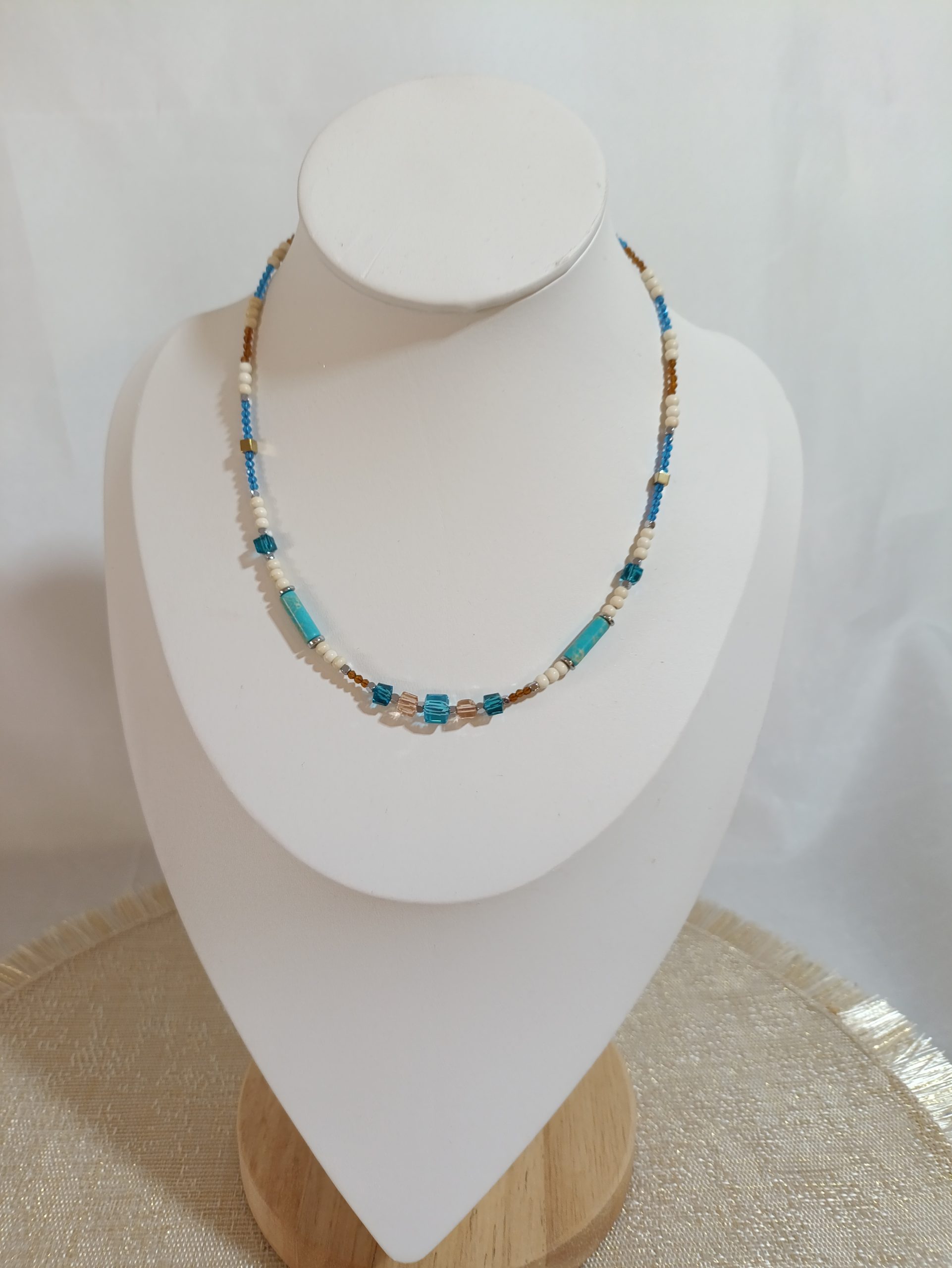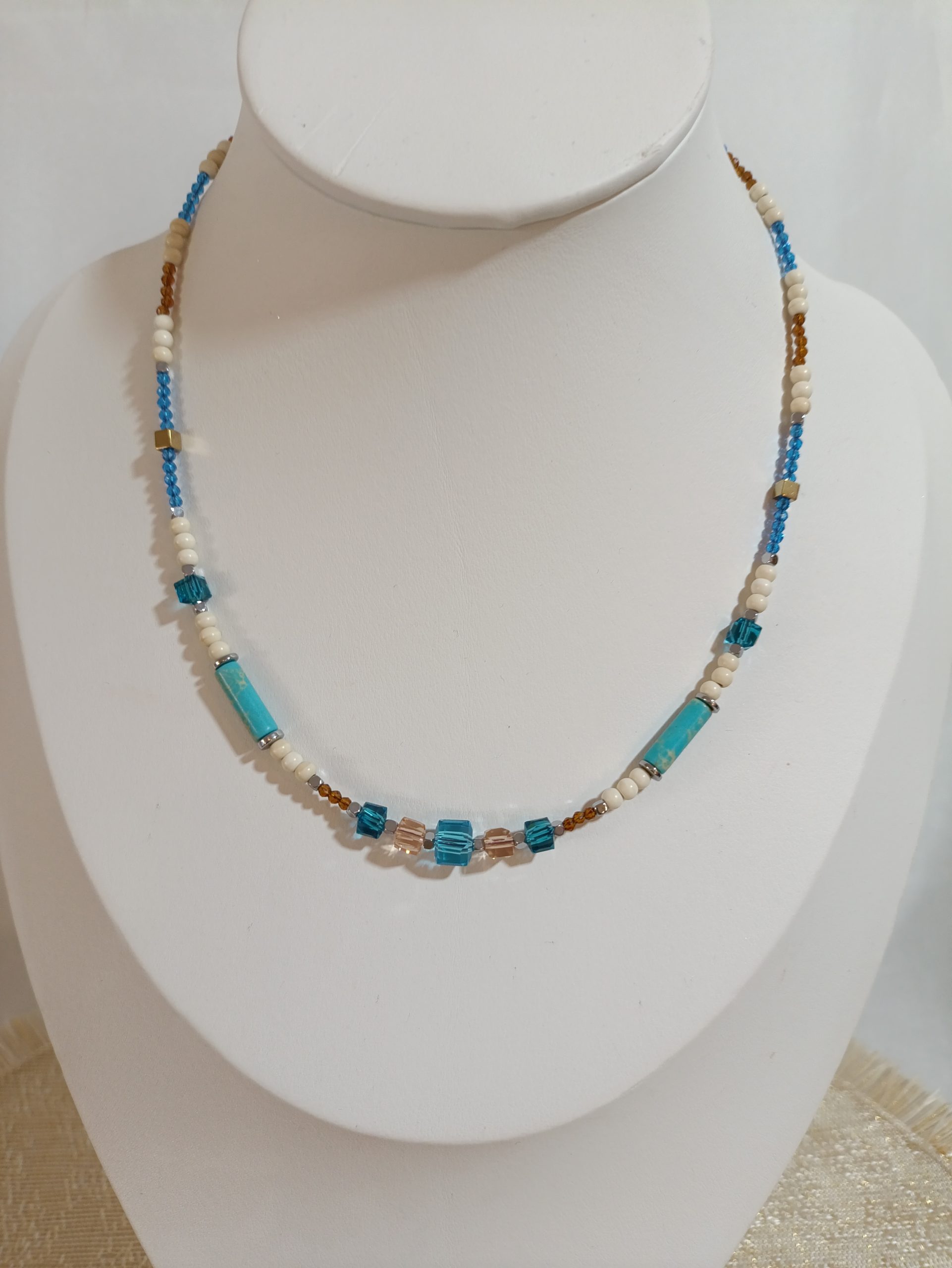 Απαλές γαλάζιες χάντρες σε συνδυασμό με λευκές λεπτομέρειες δημιουργούν μια σύνθεση γαλήνης. Θυμίζει το φως του φεγγαριού που καθρεφτίζεται στο νερό. Ένα κολιέ που αποπνέει ηρεμία και αρμονία.