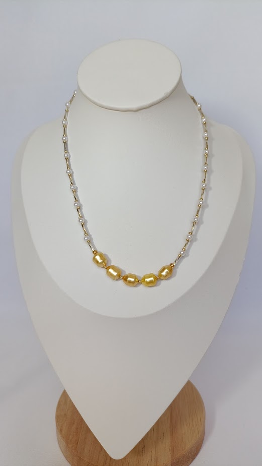 Χρυσές χάντρες σε διακριτική λευκή βάση – κομψό και λαμπερό, σαν τις ακτίνες του ήλιου πάνω στην άμμο.