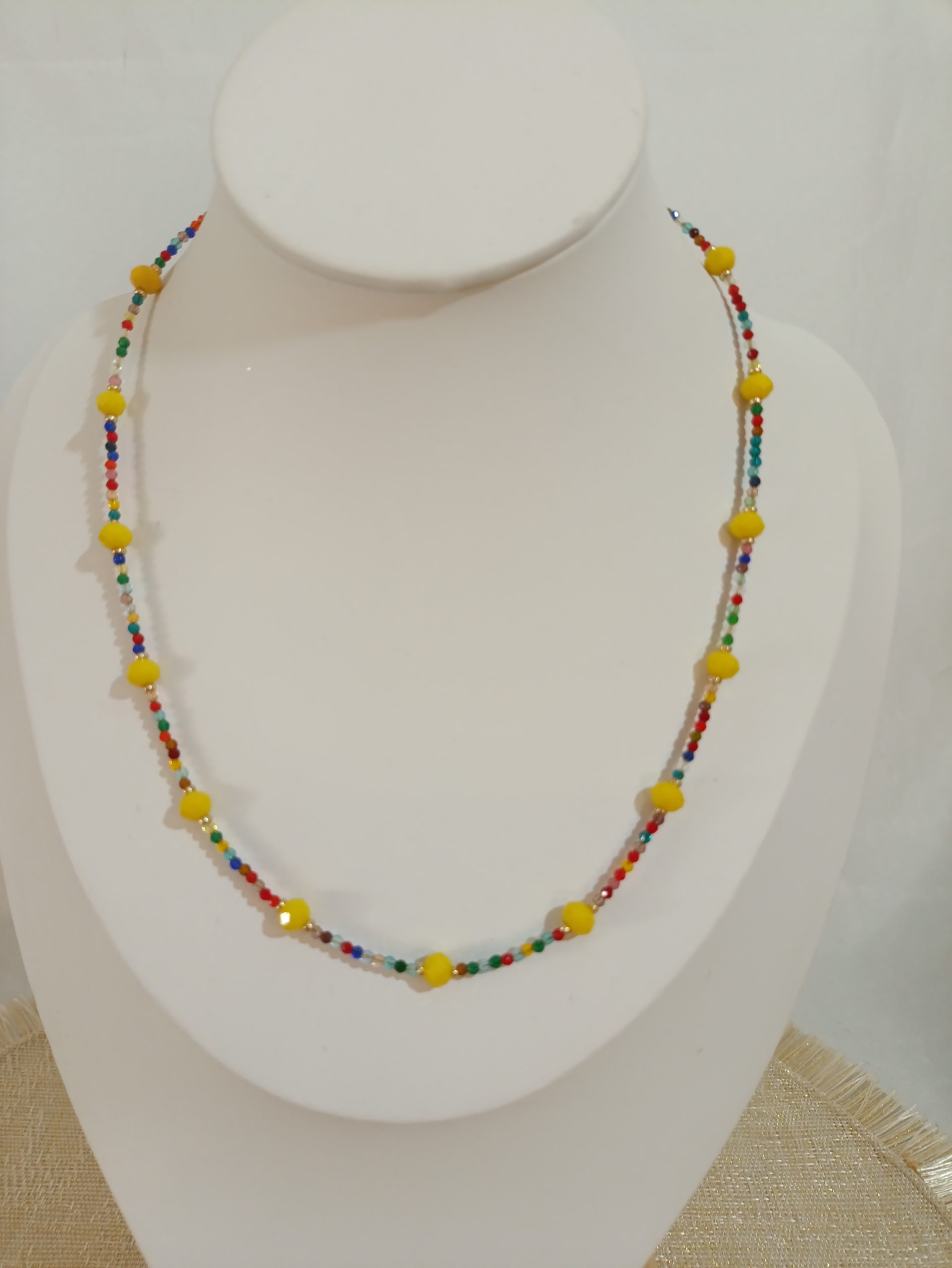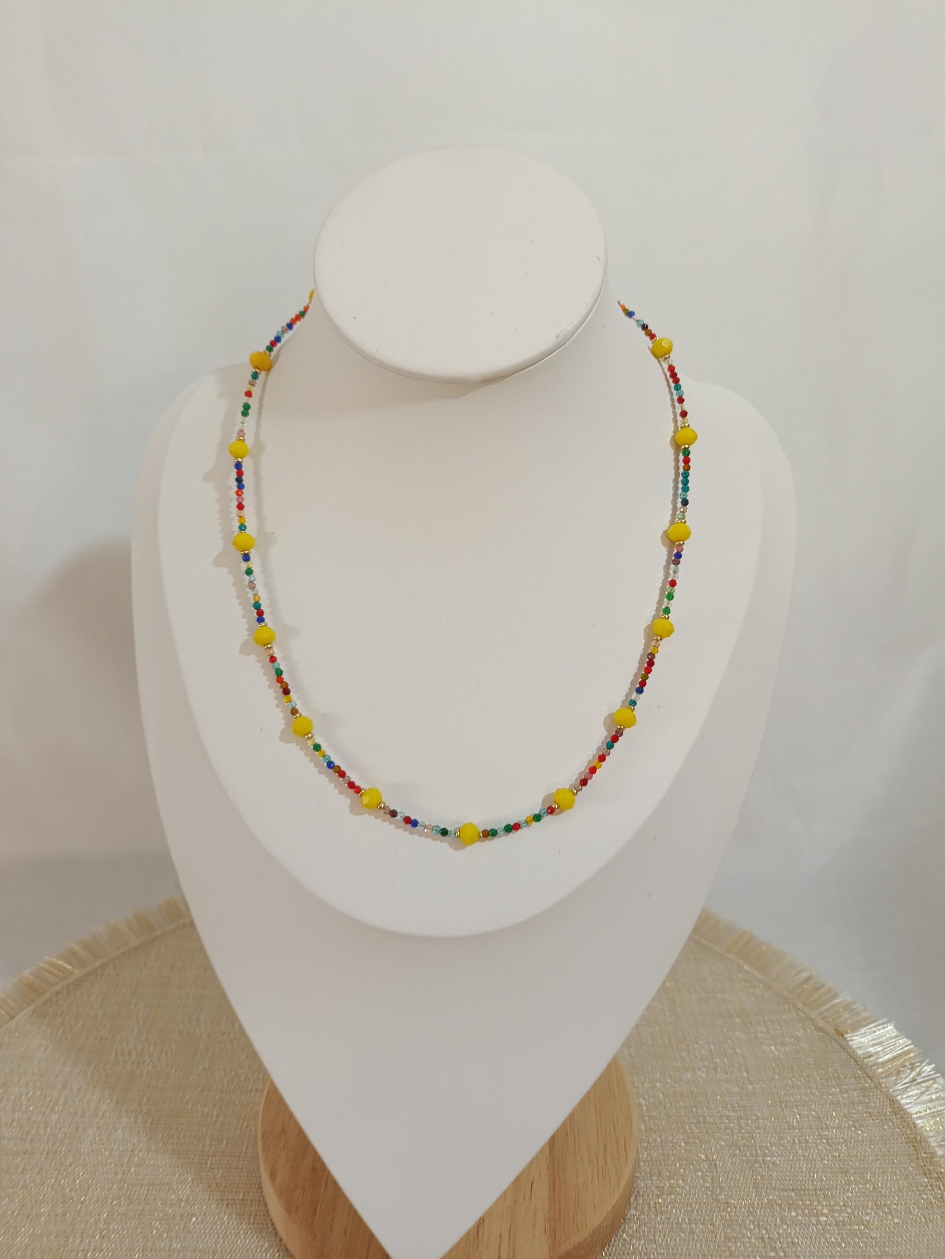 Ένα κολιέ γεμάτο φως και χρώμα, με χάντρες που θυμίζουν ακτίνες καλοκαιρινού ήλιου. Οι έντονες αποχρώσεις του φέρνουν χαρά και παιχνιδιάρικη ενέργεια σε κάθε εμφάνιση. Ιδανικό για να φωτίσει την καθημερινότητα και να συνοδεύσει τις πιο ανάλαφρες στιγμές σου.