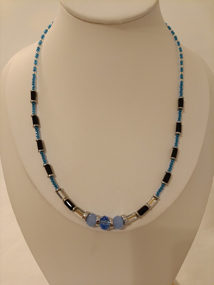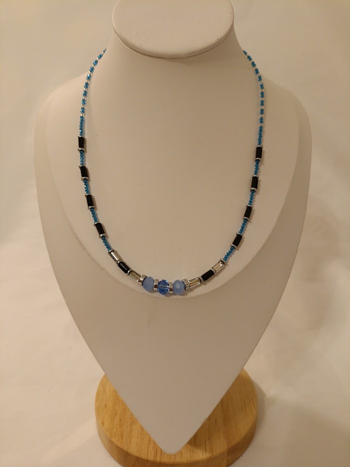 Απαλές μπλε αποχρώσεις ταξιδεύουν πάνω στο ντεκολτέ σαν τις πρώτες σταγόνες της νύχτας πριν ξημερώσει. Ένα κομμάτι που ενώνει φως και σκοτάδι, με χάντρες που λάμπουν διακριτικά. Ιδανικό για στιγμές που αναζητάς κάτι ήρεμο αλλά εκφραστικό. Στέκεται σαν ψίθυρος κομψότητας που δεν χρειάζεται πολλά.