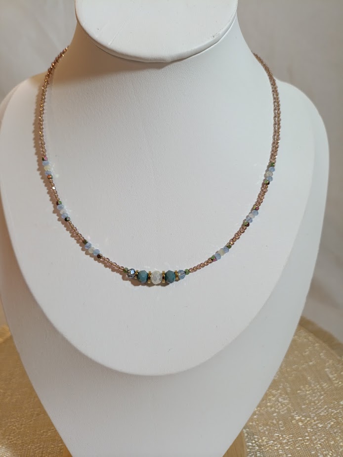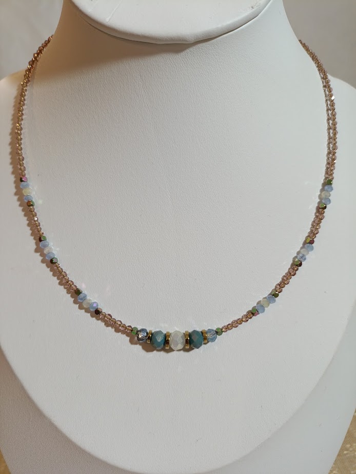 Συνδυασμός γαλάζιων και γήινων αποχρώσεων που θυμίζουν το κύμα που σκάει πάνω στην άμμο. Ένα κολιέ ελαφρύ, αέρινο, με διάθεση καλοκαιριού. Φοριέται όλες τις ώρες, χαρίζοντας δροσιά στην εμφάνιση