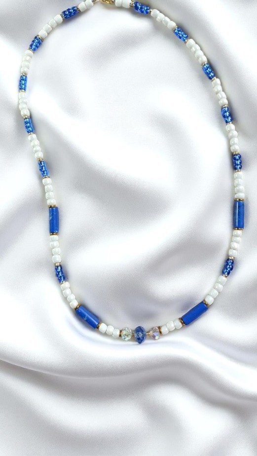 Με βαθύ μπλε και λευκές πινελιές, το “Ocean Depths” σε καλεί να βυθιστείς στη γαλήνη και το μυστήριο της θάλασσας. Το συμμετρικό του design και η διακριτική λάμψη στις χάντρες δημιουργούν ένα διαχρονικό αξεσουάρ. Συνδυάζεται υπέροχα με total white looks ή navy εμφανίσεις για απόλυτο summer chic. Για όσες αγαπούν την ισορροπία ανάμεσα στην κομψότητα και την τόλμη.