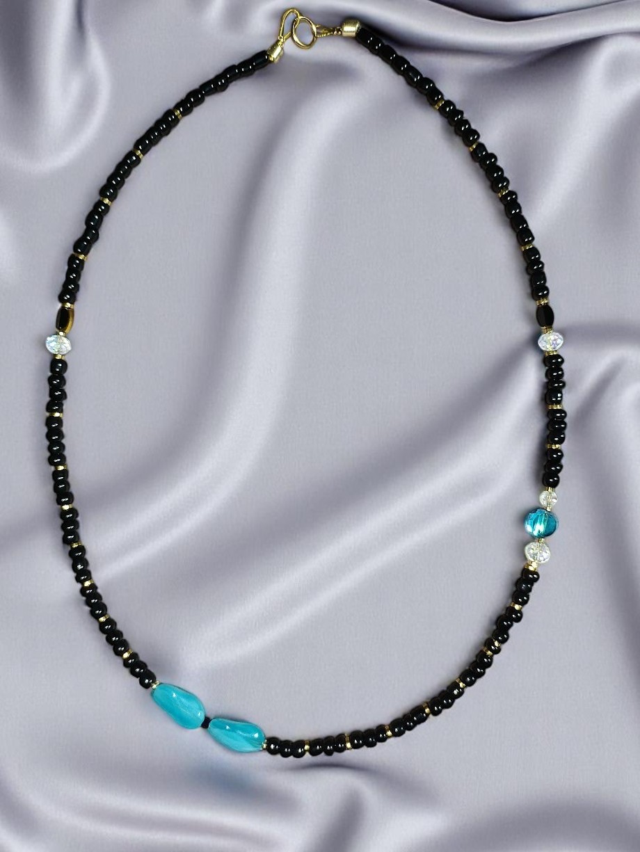 Μαύρες και γαλάζιες χάντρες σε αρμονία, δημιουργούν μια αίσθηση μυστηρίου και ηρεμίας – σαν να περπατάς δίπλα στη θάλασσα κατά το σούρουπο. Ένα καθημερινό κόσμημα με βαθιά αισθητική.