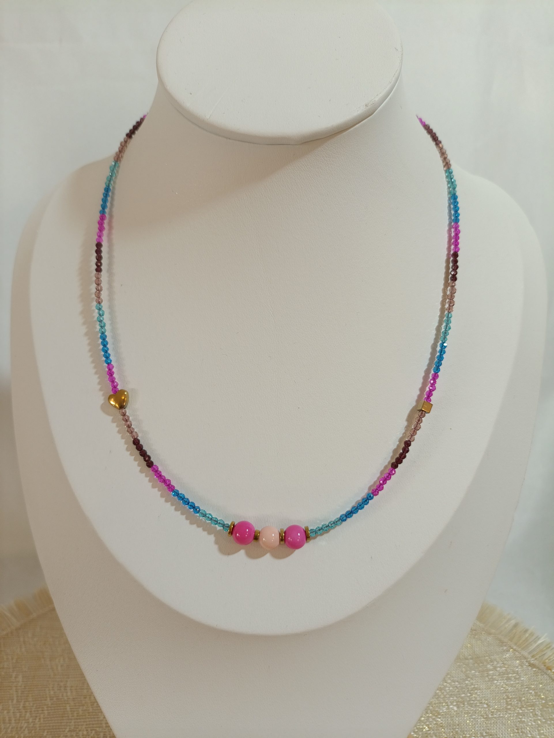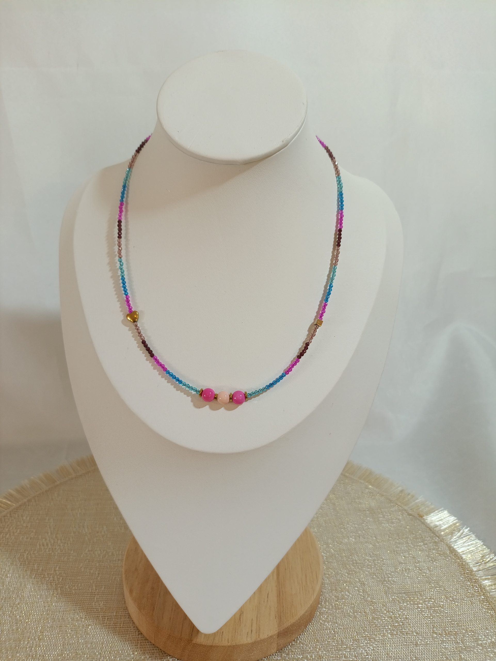 Ροζ και παστέλ χάντρες μπλέκονται αρμονικά σε μια γλυκιά σύνθεση. Θυμίζει ολάνθιστους κήπους γεμάτους ευωδιές και απαλή αύρα. Ένα κολιέ που φέρνει ρομαντισμό σε κάθε εμφάνιση.