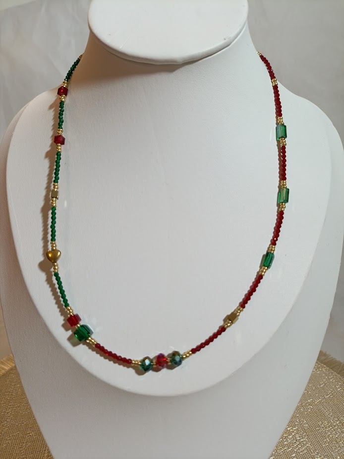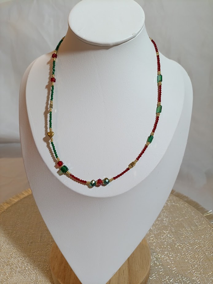 Κόκκινο και πράσινο μπλέκονται σαν τριαντάφυλλα σε μυστικό κήπο. Ένα κολιέ γεμάτο θηλυκότητα και πάθος. Για όσες αγαπούν τον ρομαντισμό με έντονη παρουσία.