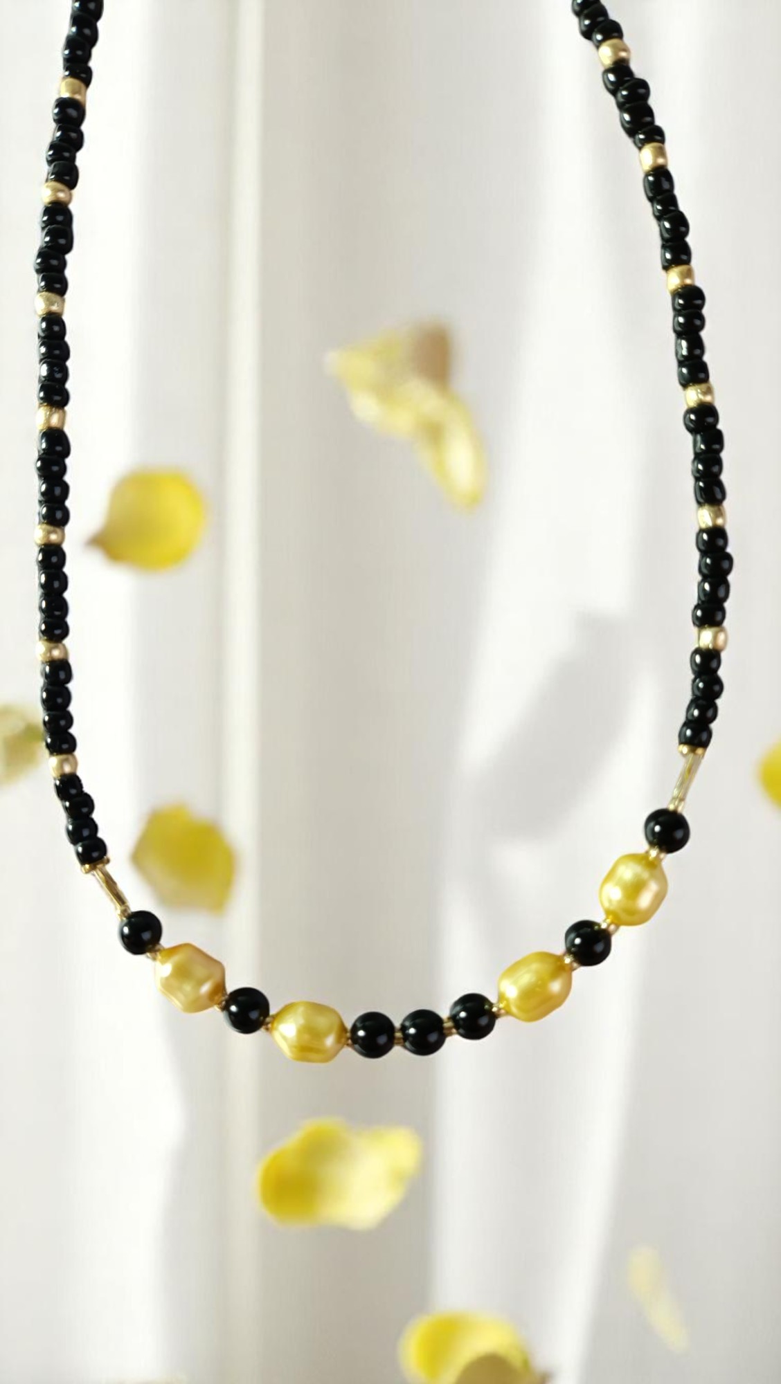 Το Solar Eclipse είναι ένα εντυπωσιακό χειροποίητο κολιέ που συνδυάζει τη φωτεινότητα του ήλιου με το μυστήριο της έκλειψης. Η οβάλ, πολυεδρική γυάλινη χάντρα σε έντονο κίτρινο λειτουργεί σαν ηλιακή λάμψη, ενώ οι μαύρες χάντρες δημιουργούν έντονη αντίθεση, αποπνέοντας δύναμη και στυλ. Ιδανικό για όσες θέλουν να ξεχωρίζουν με ένα κομμάτι γεμάτο ένταση και αρμονία.