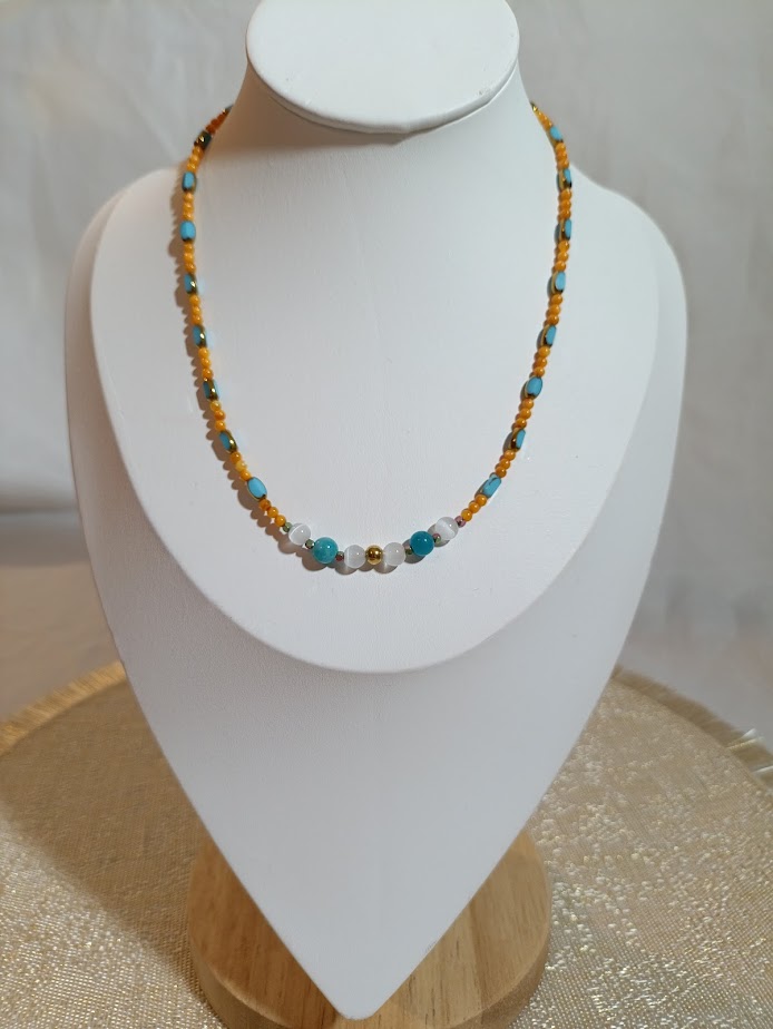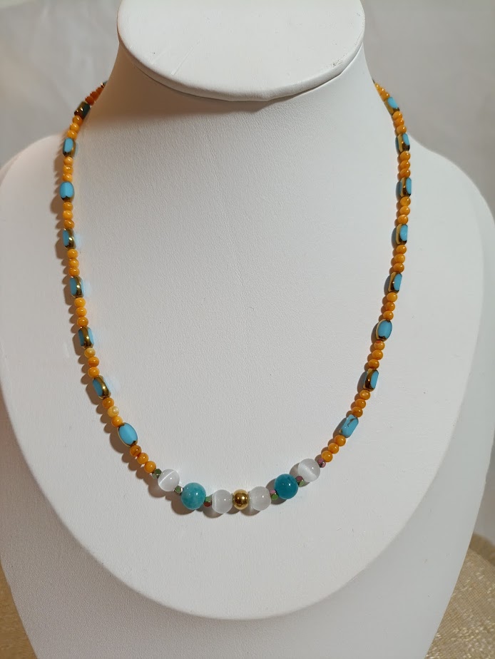 Κίτρινο, πορτοκαλί και γαλάζιο σε ένα φωτεινό παιχνίδι που θυμίζει δύση του ήλιου. Ένα κολιέ γεμάτο χαρά και ενέργεια. Για γυναίκες που αγαπούν το φως.
