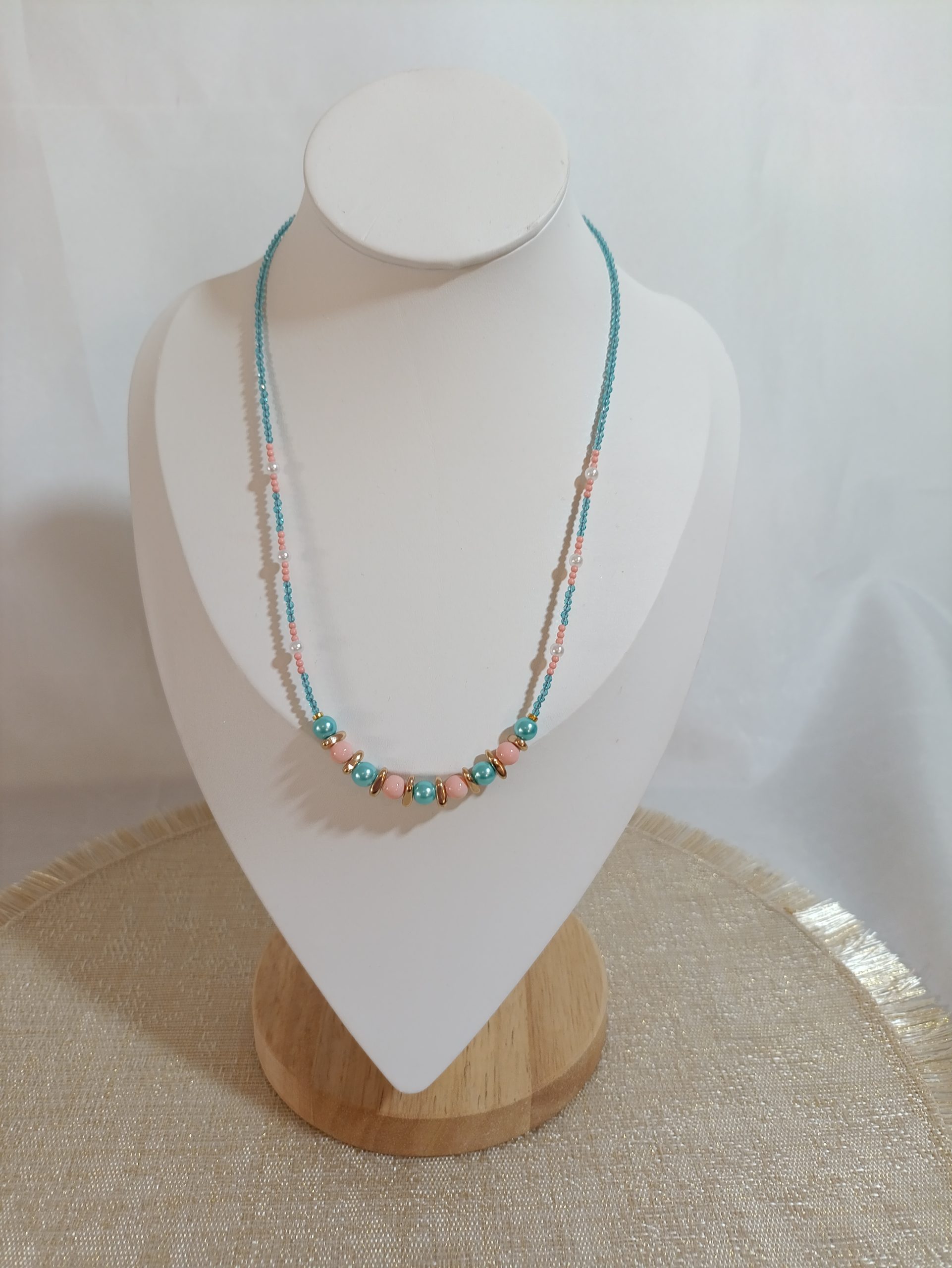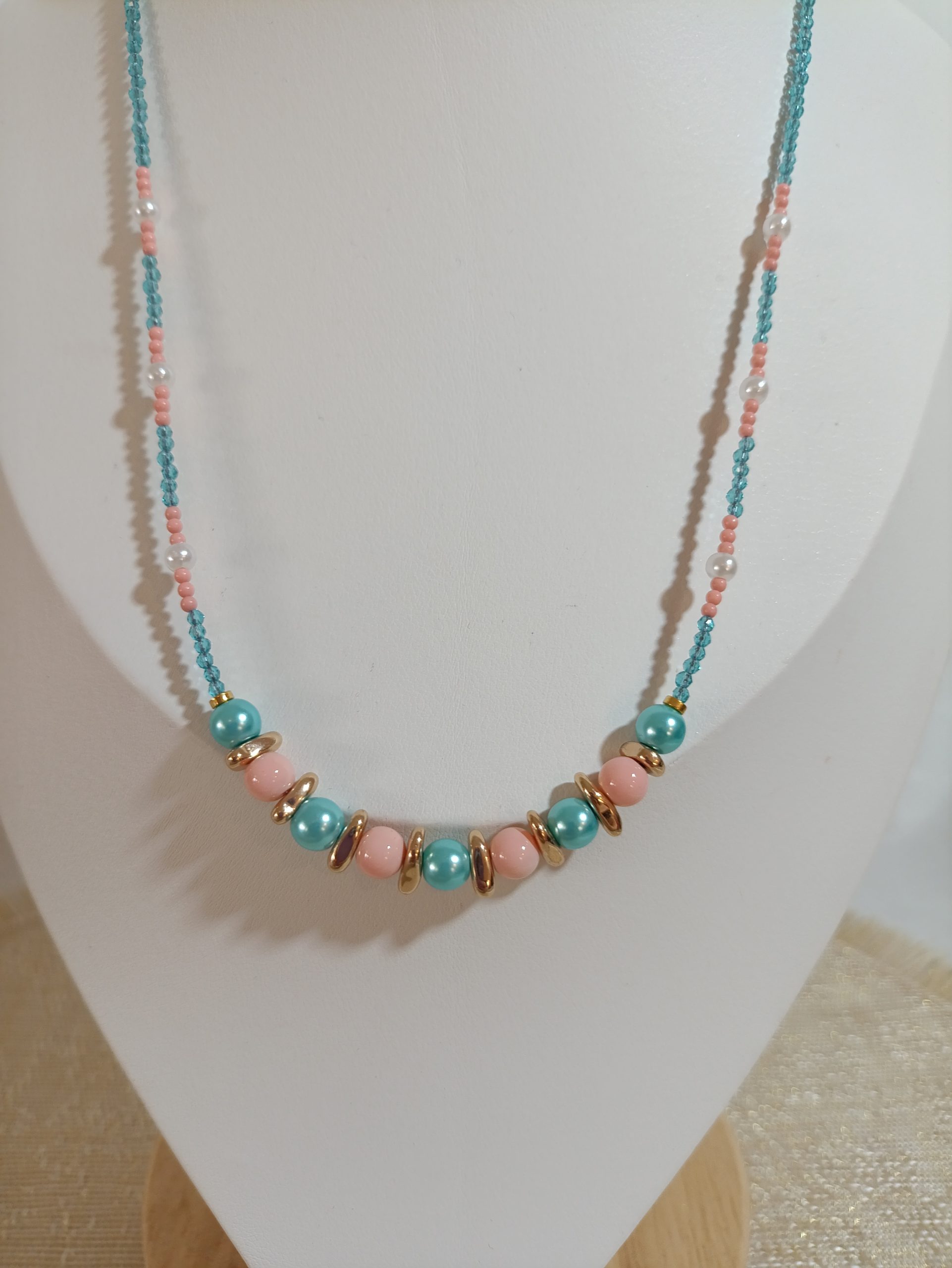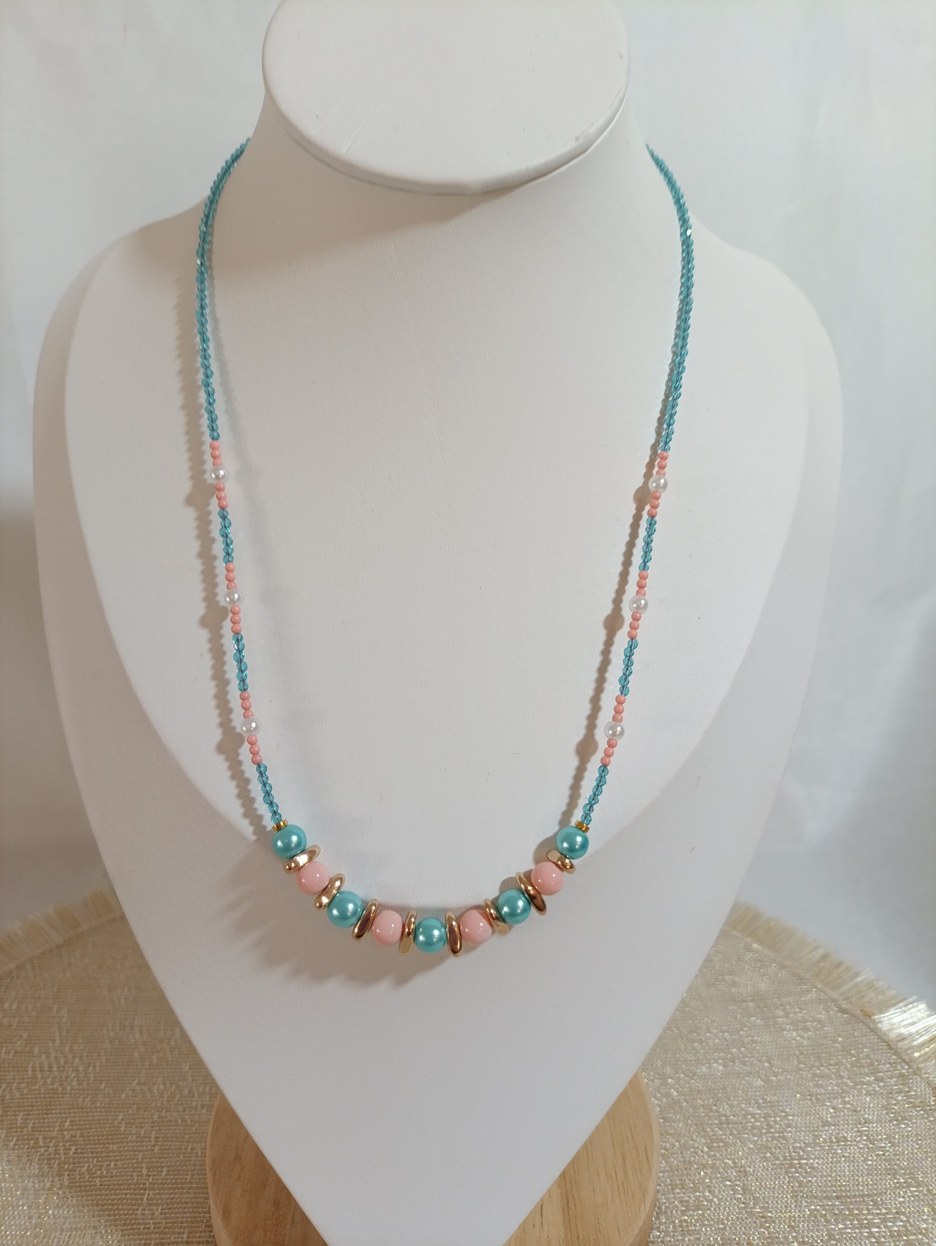 Συνδυασμός τιρκουάζ και λευκών χαντρών, σαν θάλασσα που συναντά τον αφρό των κυμάτων. Ένα κολιέ γεμάτο καλοκαιρινές μνήμες και ανάλαφρη ενέργεια. Ιδανικό για να δώσει φρεσκάδα σε κάθε εμφάνιση.