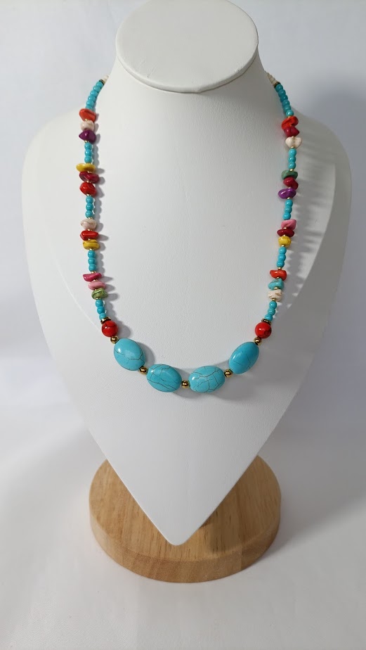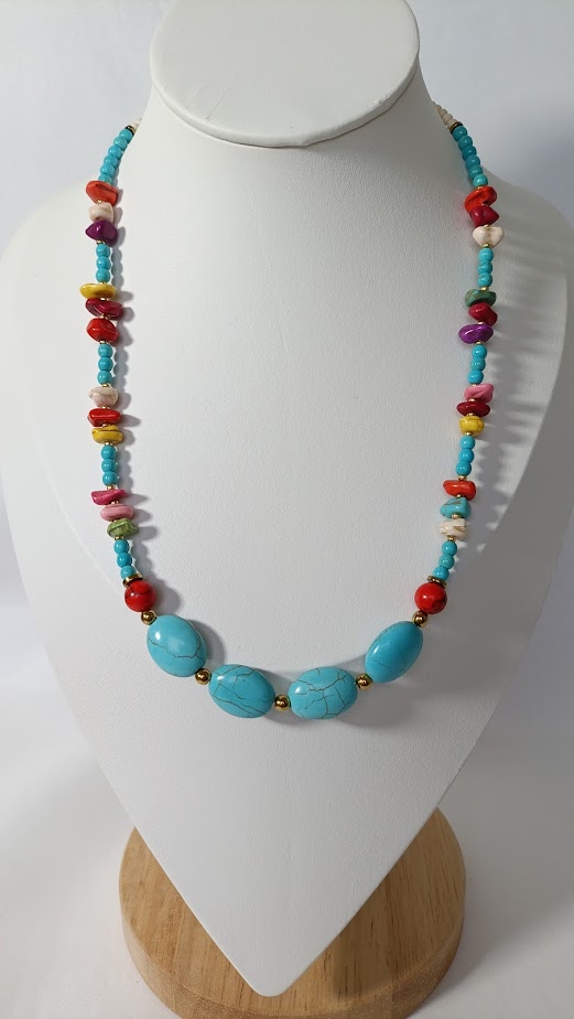 Οι μεγάλες τυρκουάζ πέτρες – σταθερές και γήινες – αγκαλιάζονται από πολύχρωμες πλανητικές πινελιές που μοιάζουν με μικρά μετέωρα στον χορό της δημιουργίας.