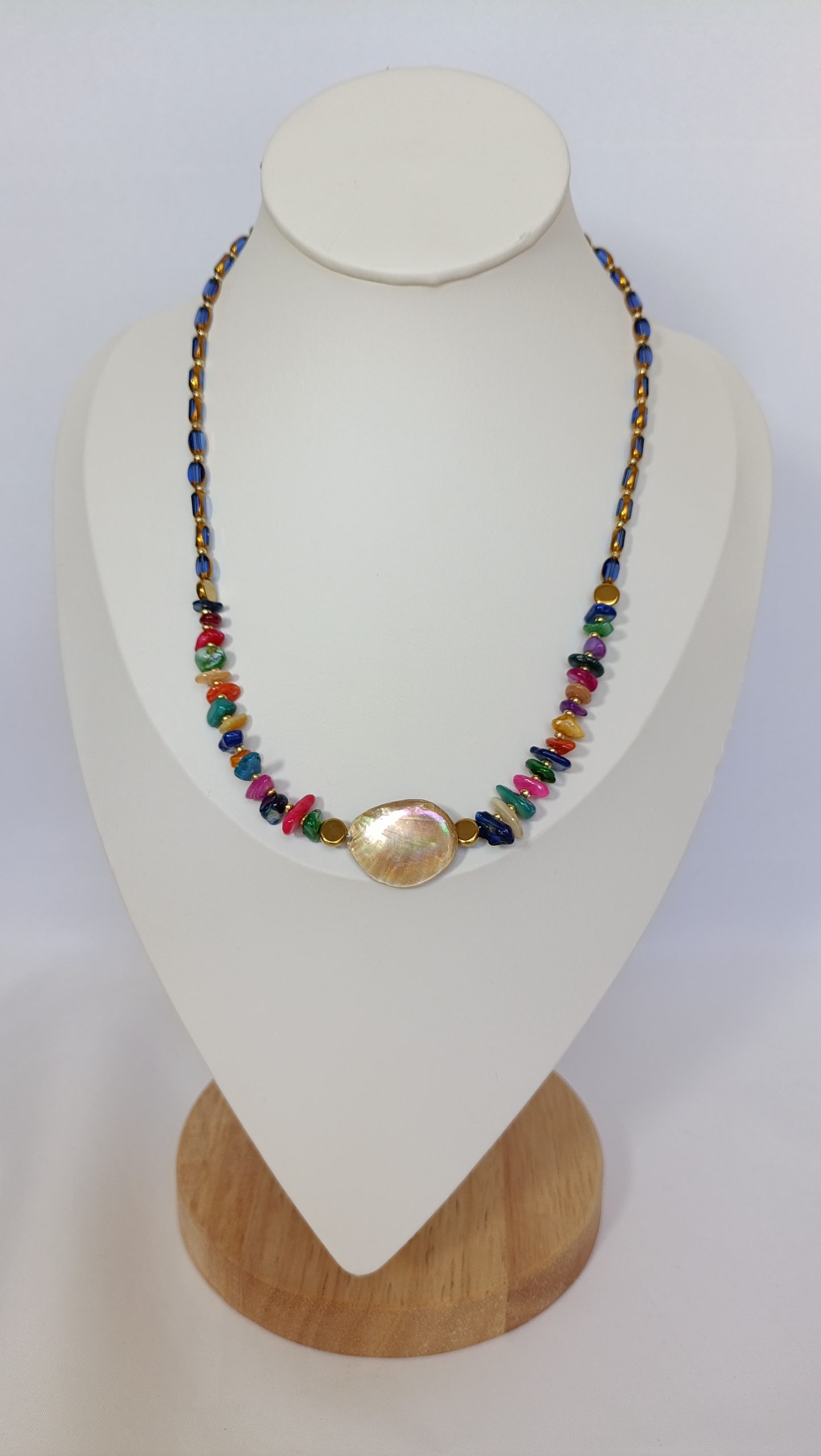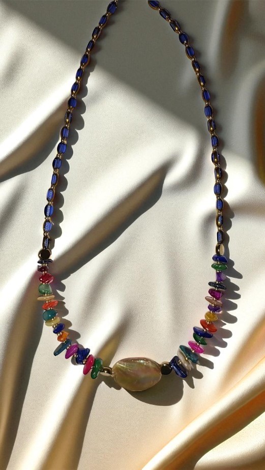 Ένα ταξίδι σε γαλαξιακό κήπο. Πολύχρωμες, ημιπολύτιμες χάντρες και βαθυμπλέ λεπτομέρειες σε μια συμφωνία χρωμάτων που χαρίζει ζωντάνια και μυστήριο. Στο κέντρο, μία μεγάλη φυσική πέτρα που εκπέμπει δύναμη.