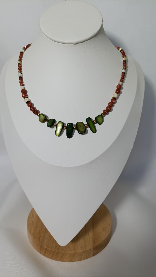 Γήινο και κομψό, αποπνέει ζεστασιά και φυσικότητα. Οι πράσινες χάντρες σε συνδυασμό με τις καφέ αποχρώσεις το κάνουν ιδανικό για φθινοπωρινά looks. Χειροποίητο με προσοχή στη λεπτομέρεια.