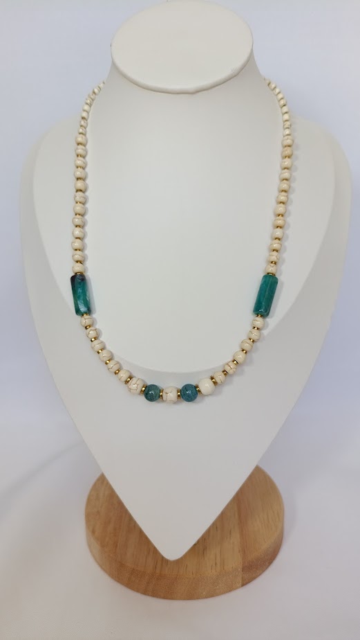 Αυτό το κομψό κολιέ συνδυάζει ivory λευκές χάντρες με πράσινους και μπλε ημιπολύτιμους λίθους. Μια elegant επιλογή που φέρνει τη φρεσκάδα της φύσης κοντά σου – ιδανικό για καθημερινή χρήση ή boho εμφανίσεις.