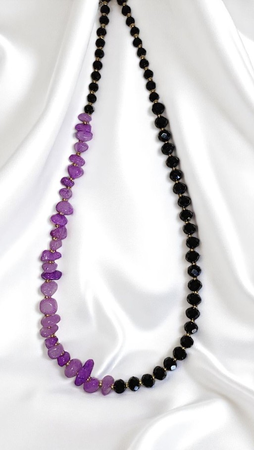 Μωβ και μαύρο – μια δυναμική, σκοτεινή και μυστήρια αρμονία. Ένα κολιέ που αναδεικνύει το alternative κομμάτι του εαυτού σου. Ιδανικό για βραδινές εμφανίσεις ή ροκ-ρομαντικά looks. Statement κόσμημα με ένταση.