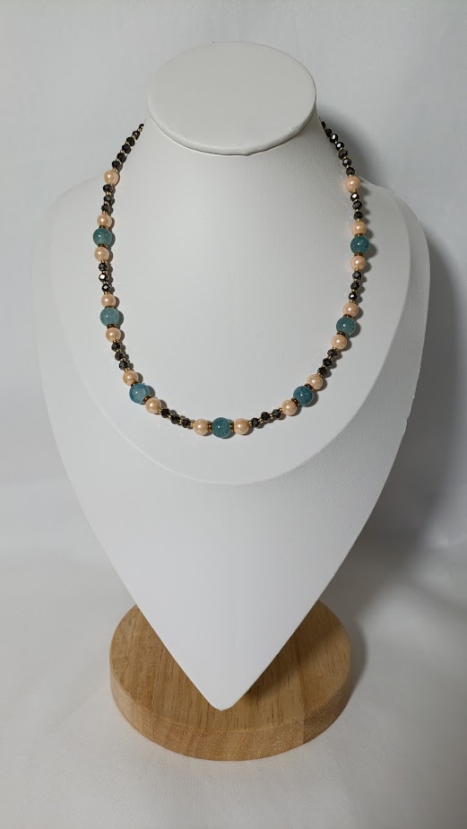 Ένα κομψό και ιδιαίτερο κολιέ που συνδυάζει περλέ μπίλιες, μαύρες κρυστάλλινες χάντρες και εντυπωσιακές πράσινες πέτρες με ανάγλυφη υφή. Το “Mystic Pearl” ακτινοβολεί φινέτσα και μυστήριο – ιδανικό για βραδινές εμφανίσεις ή για να δώσεις λάμψη σε ένα απλό outfit. Διαχρονικό και elegant, ταιριάζει τέλεια με χρυσούς ή μαύρους τόνους.