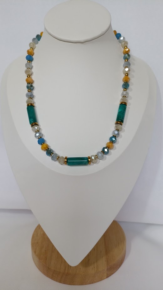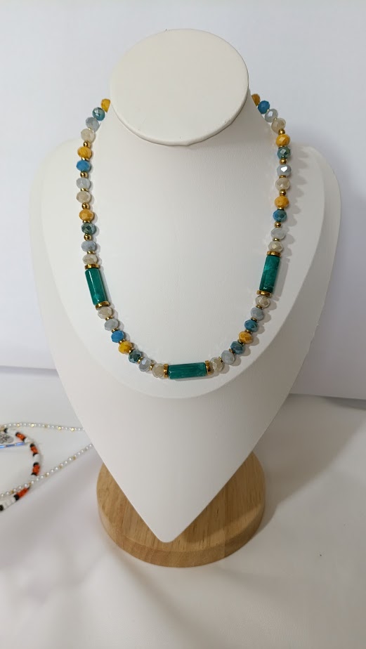 Πράσινες χάντρες σαν πετράδια, πλαισιωμένες από πολύχρωμες λεπτομέρειες.