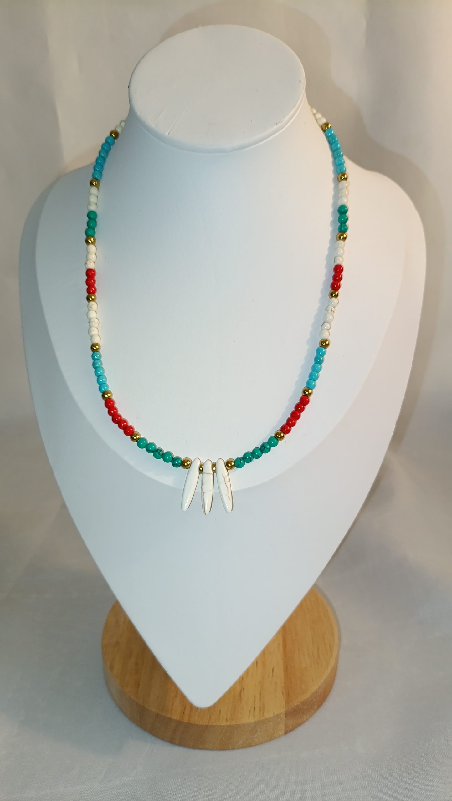 Με αποχρώσεις του τιρκουάζ και του κόκκινου, και τρία λευκά “δόντια” στο κέντρο, θυμίζει τρόπαιο που φέρνει η θάλασσα.