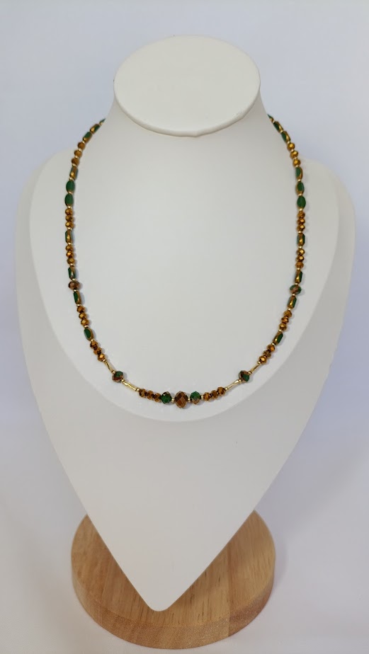 Χρυσές, πράσινες και μπρονζέ χάντρες σε συνδυασμό που θυμίζει φθινοπωρινό δάσος στο ηλιοβασίλεμα.