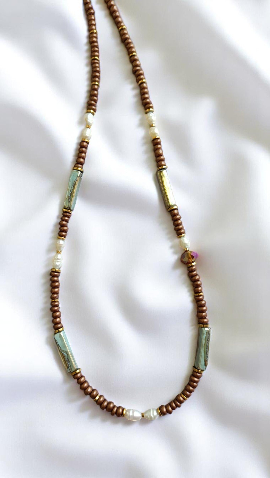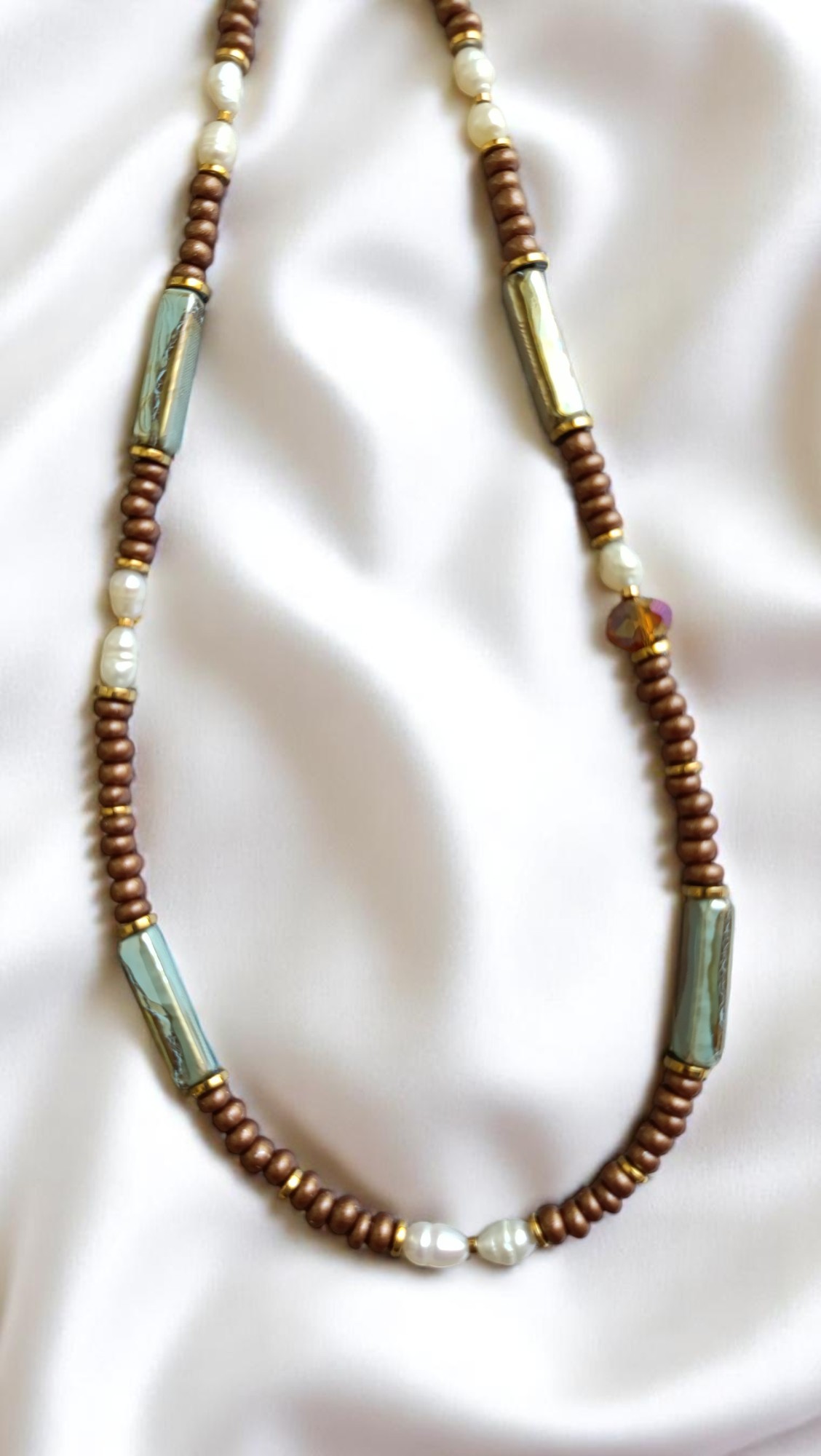 Μεγάλες κεραμικές χάντρες σε ημιδιάφανες αποχρώσεις, πέρλες και χάλκινοι τόνοι. Ένα κομμάτι με vintage αύρα και πολυτέλεια.