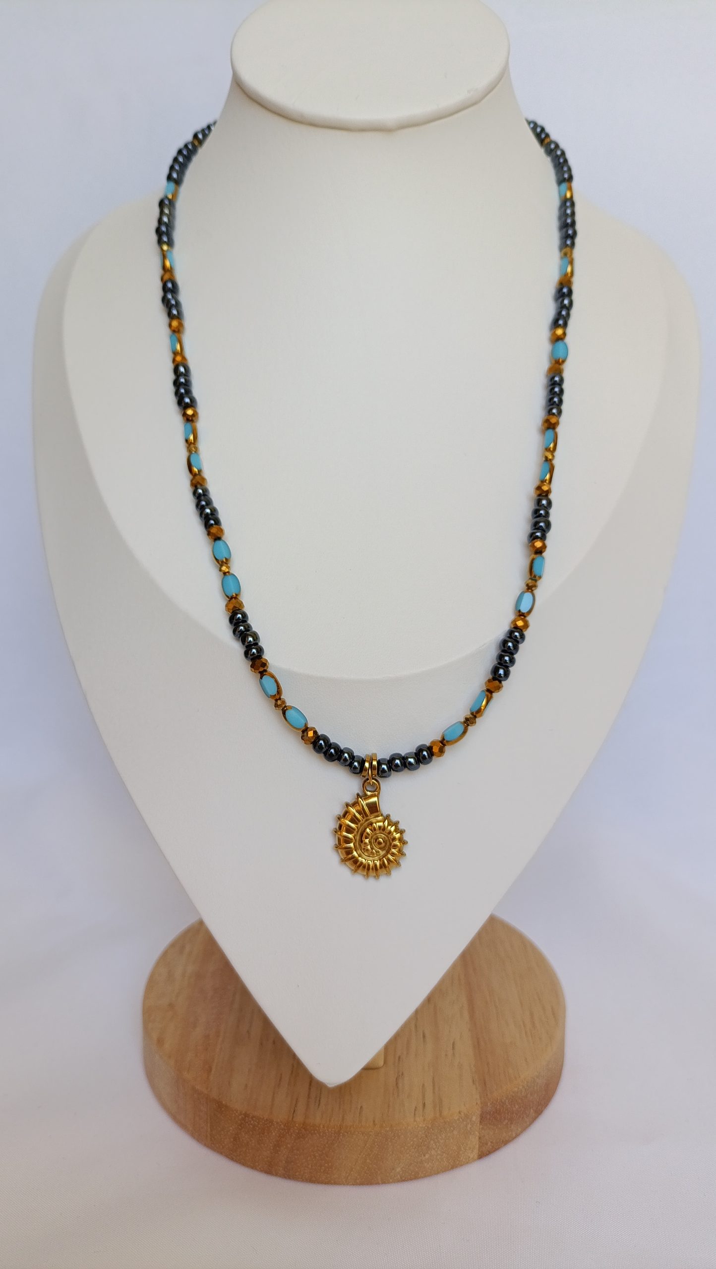 Χειροποίητο κολιέ με λαμπερές γκρι κρυστάλλινες χάντρες, τυρκουάζ λεπτομέρειες και επιχρυσωμένα ενδιάμεσα στοιχεία. Στο κέντρο δεσπόζει εντυπωσιακό μενταγιόν σε σχήμα αμμωνίτη, εμπνευσμένο από τη φυσική κομψότητα των θαλάσσιων απολιθωμάτων. Ιδανικό για όσες αγαπούν το μποέμ και elegant ύφος, φέρνει μαζί του αύρα καλοκαιριού και διαχρονικής γοητείας.