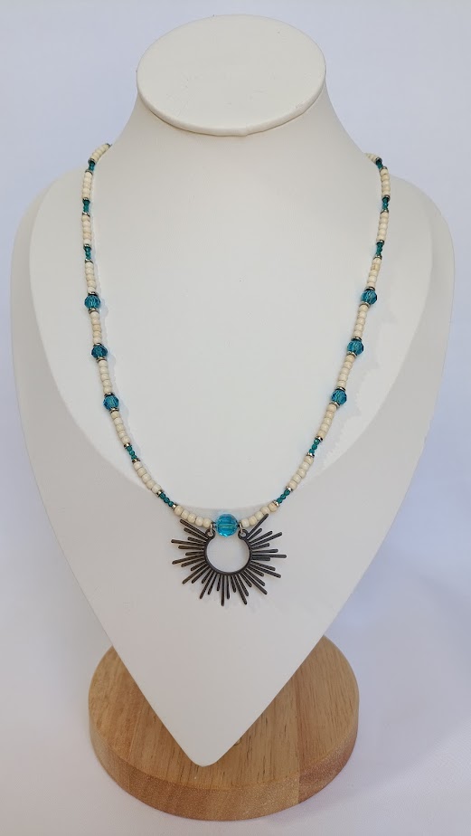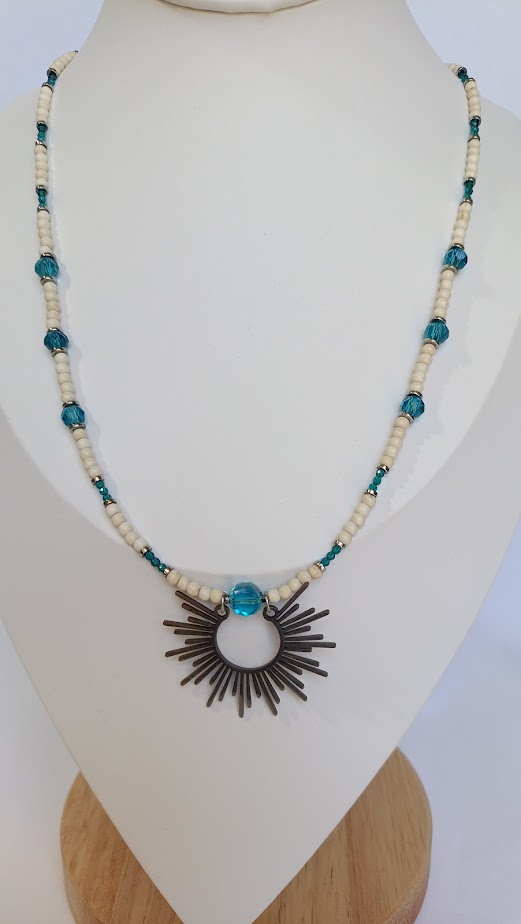 Ένα ηλιακό στοιχείο αγκαλιασμένο από τυρκουάζ χάντρες, με μικρές μεταλλικές λάμψεις. Μοναδική ισορροπία ουρανού και φωτός. Κόσμημα για ελεύθερα πνεύματα.