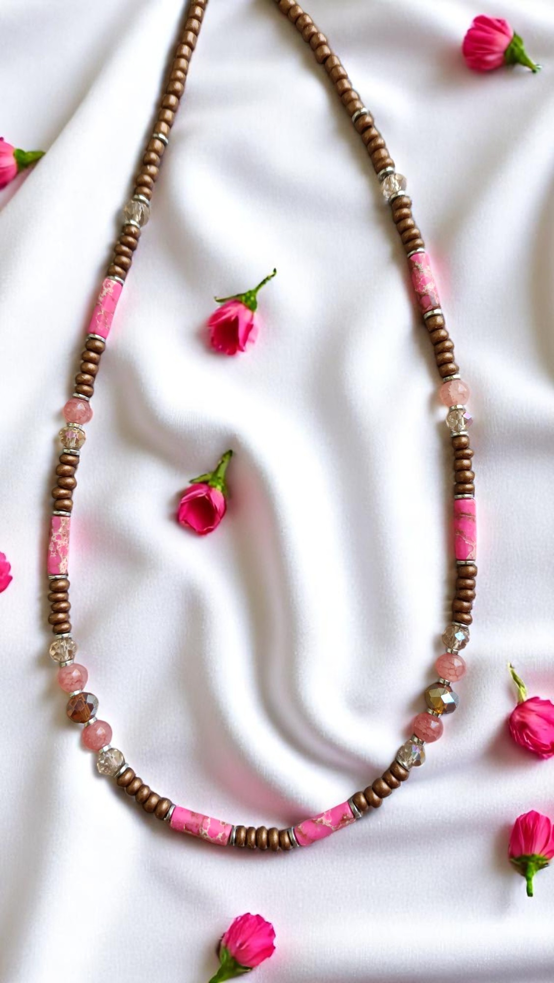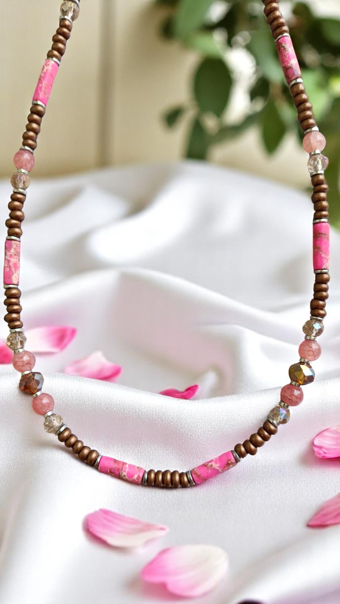 Ένα χειροποίητο κόσμημα που παντρεύει τη γήινη ενέργεια με ρομαντικές αποχρώσεις. Ο ροζ πέτρινη χάντρα, με τα μοναδικά του νερά, συνδυάζεται αρμονικά με μεταλλικές bronze χάντρες και λαμπερά, κρυστάλλινα στοιχεία. Το αποτέλεσμα είναι ένα κολιέ που αποπνέει θηλυκότητα, θερμότητα και ιδιαίτερη αισθητική – σαν μια ήρεμη δύση του ήλιου μέσα από τη φύση. Ιδανικό για boho εμφανίσεις με στυλ και αυθεντικότητα.