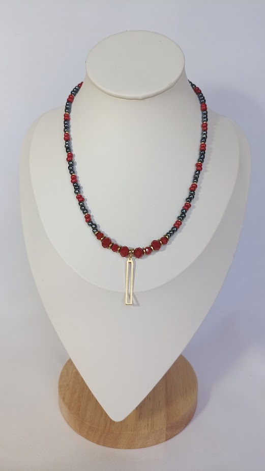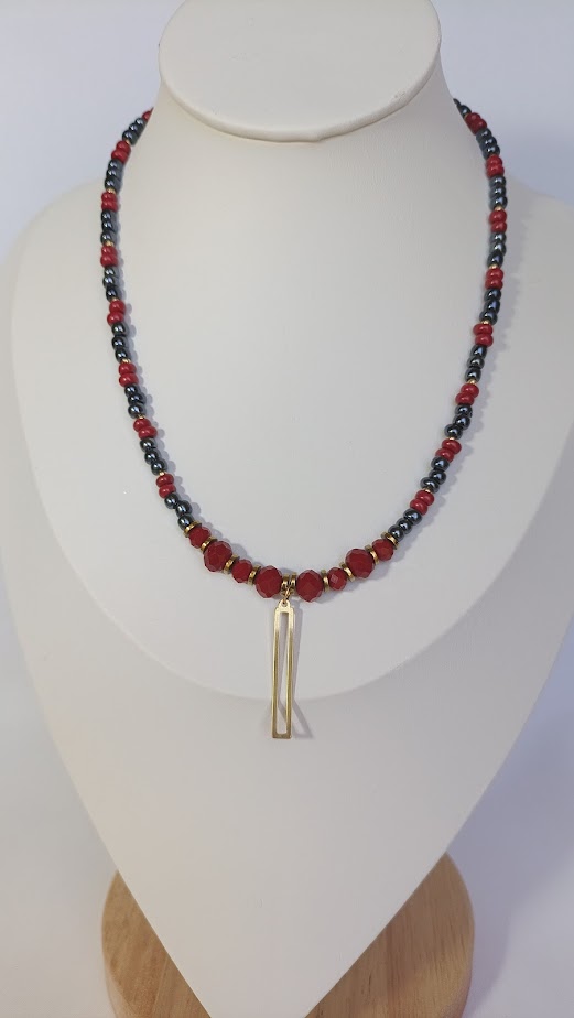 Έντονο μπορντό, βαθύ μπλε και διακριτικές χρυσές νότες συνθέτουν ένα κομψό και ατμοσφαιρικό κόσμημα. Το χρυσό στοιχείο τύπου “U” στο κέντρο προσθέτει ισορροπία και χαρακτήρα. Για εμφανίσεις που μιλούν από μόνες τους.