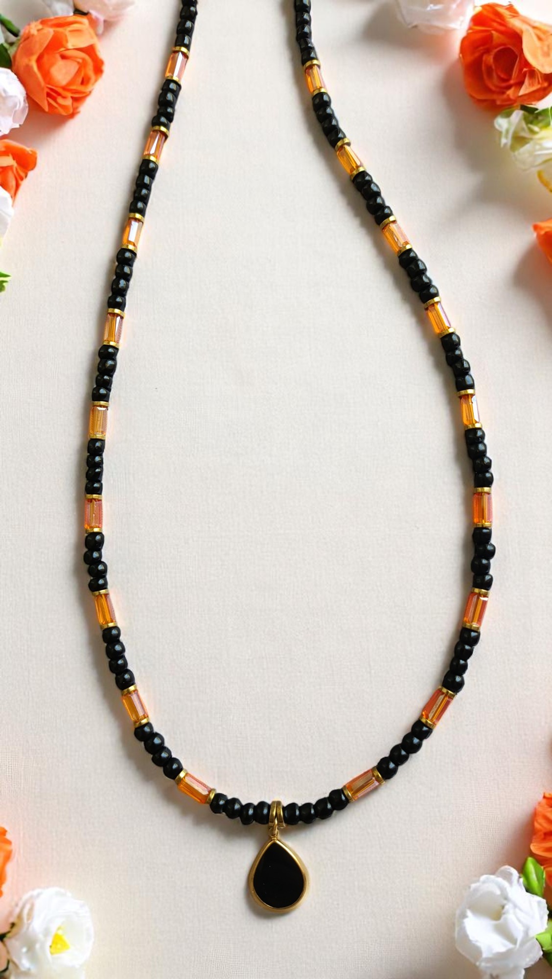 Το μαύρο της γης, το πορτοκαλί της φλόγας. Ένα κολιέ για τις τολμηρές — συνδυάζει σκοτάδι και ένταση με κομψότητα.