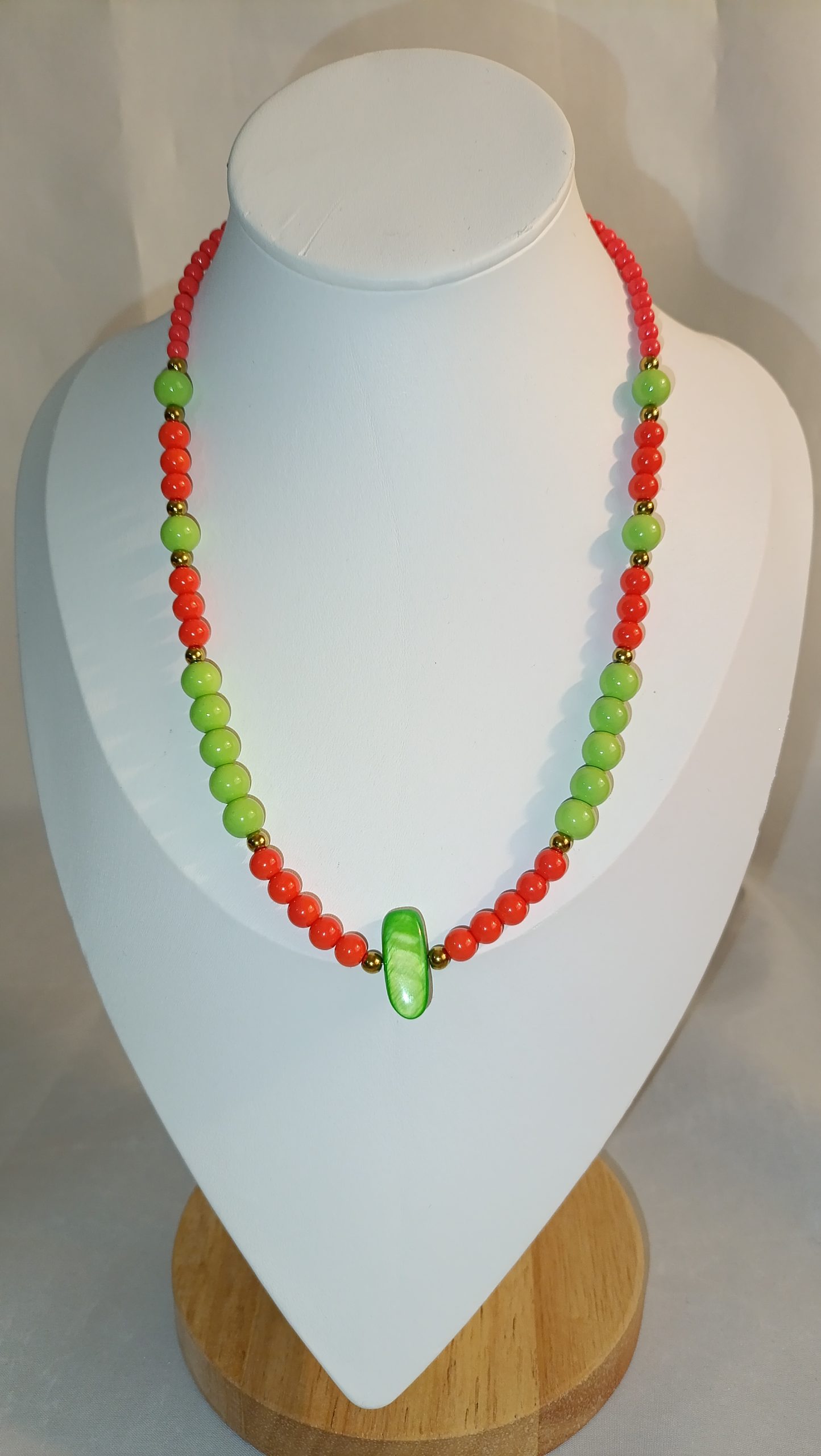 Ένα χαρούμενο κολιέ σε αποχρώσεις του κόκκινου και του πράσινου, με μια φωτεινή χάντρα στο κέντρο.