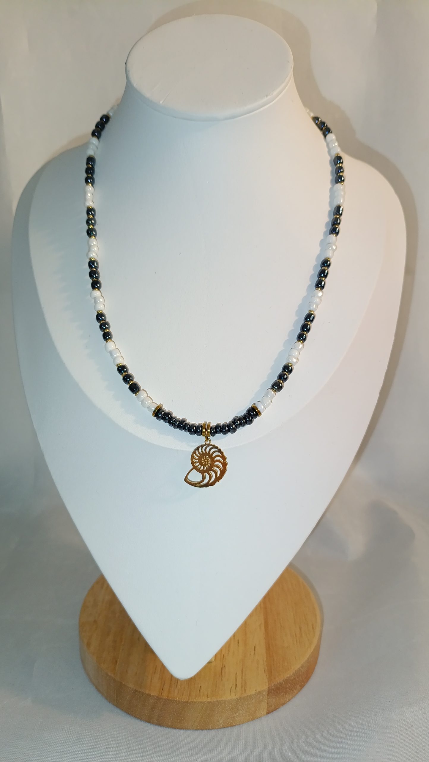 Μαύρες και λευκές χάντρες με επίχρυσο σπείρωμα κοχυλιού στο κέντρο.