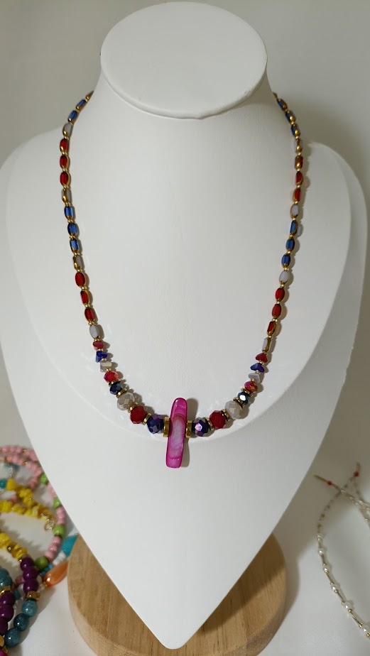 Ένα μυσταγωγικό κολιέ με αποχρώσεις του μωβ και του καφέ, στολισμένο με εντυπωσιακό κάθετο μενταγιόν αμέθυστου.