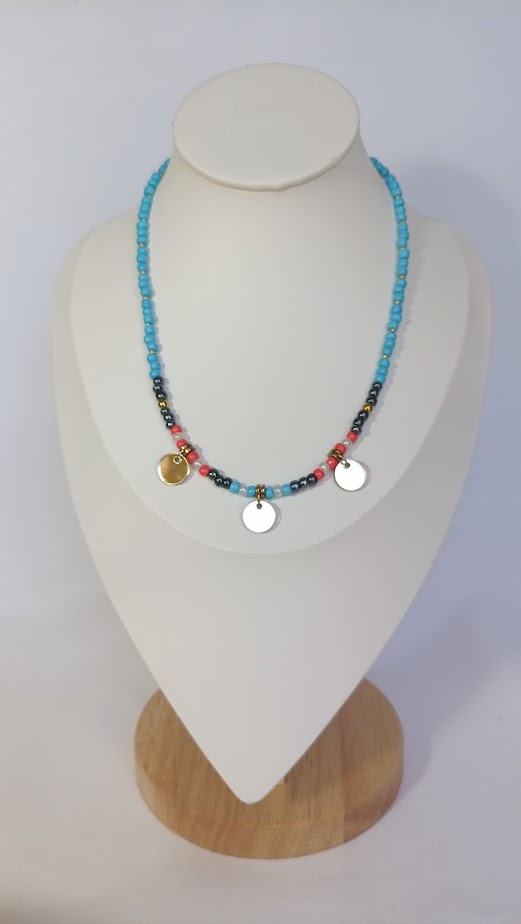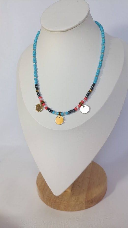 Ένα κομψό κολιέ με τιρκουάζ βάση και μεταλλικές λεπτομέρειες που θυμίζει το απαλό κύμα της θάλασσας. Τα μικρά κοχύλια και τα μεταλλικά στοιχεία προσθέτουν παιχνιδιάρικο χαρακτήρα και φρεσκάδα. Φόρεσέ το και νιώσε τη δροσιά του καλοκαιρινού αέρα πάνω στο δέρμα σου.