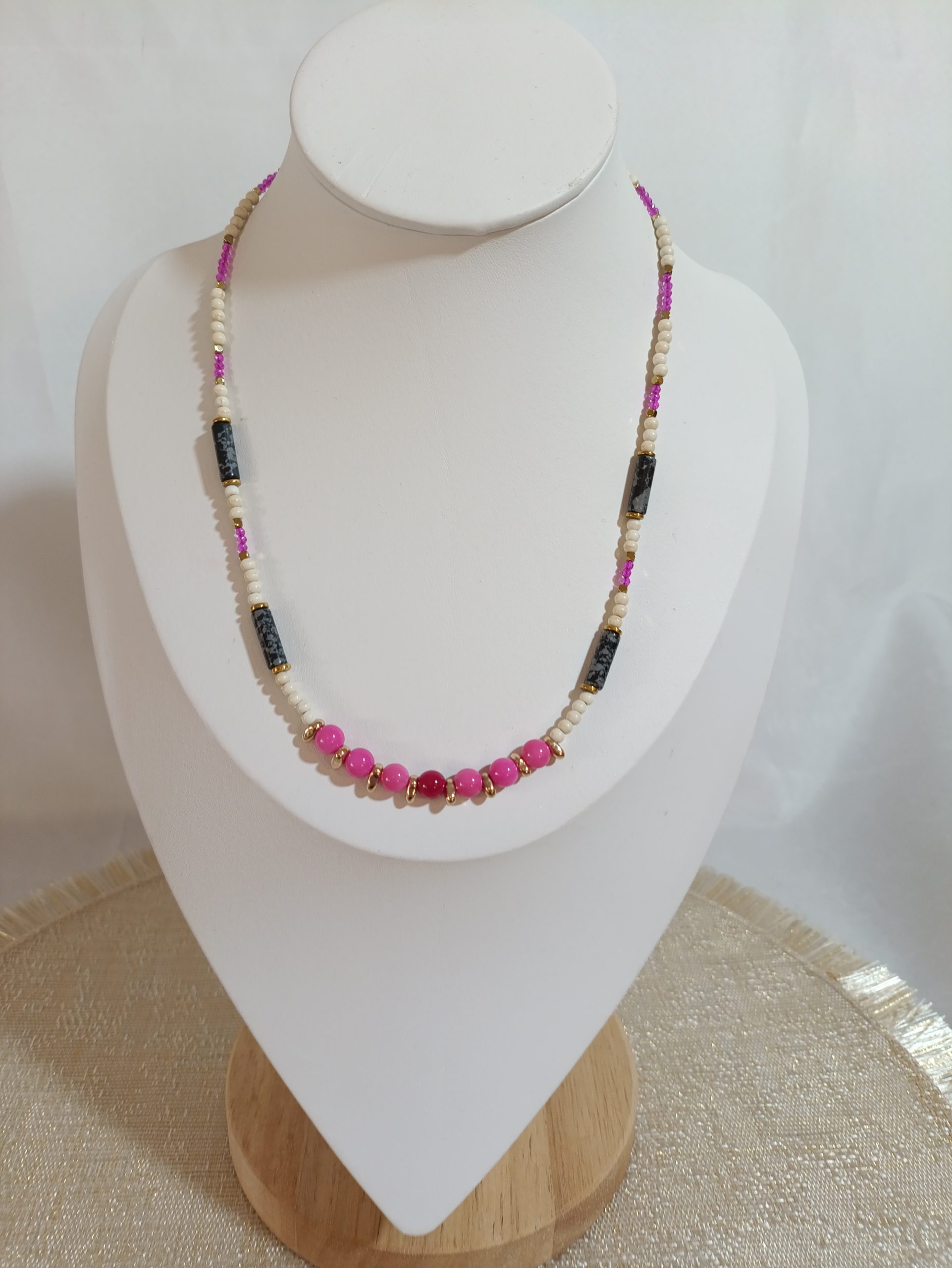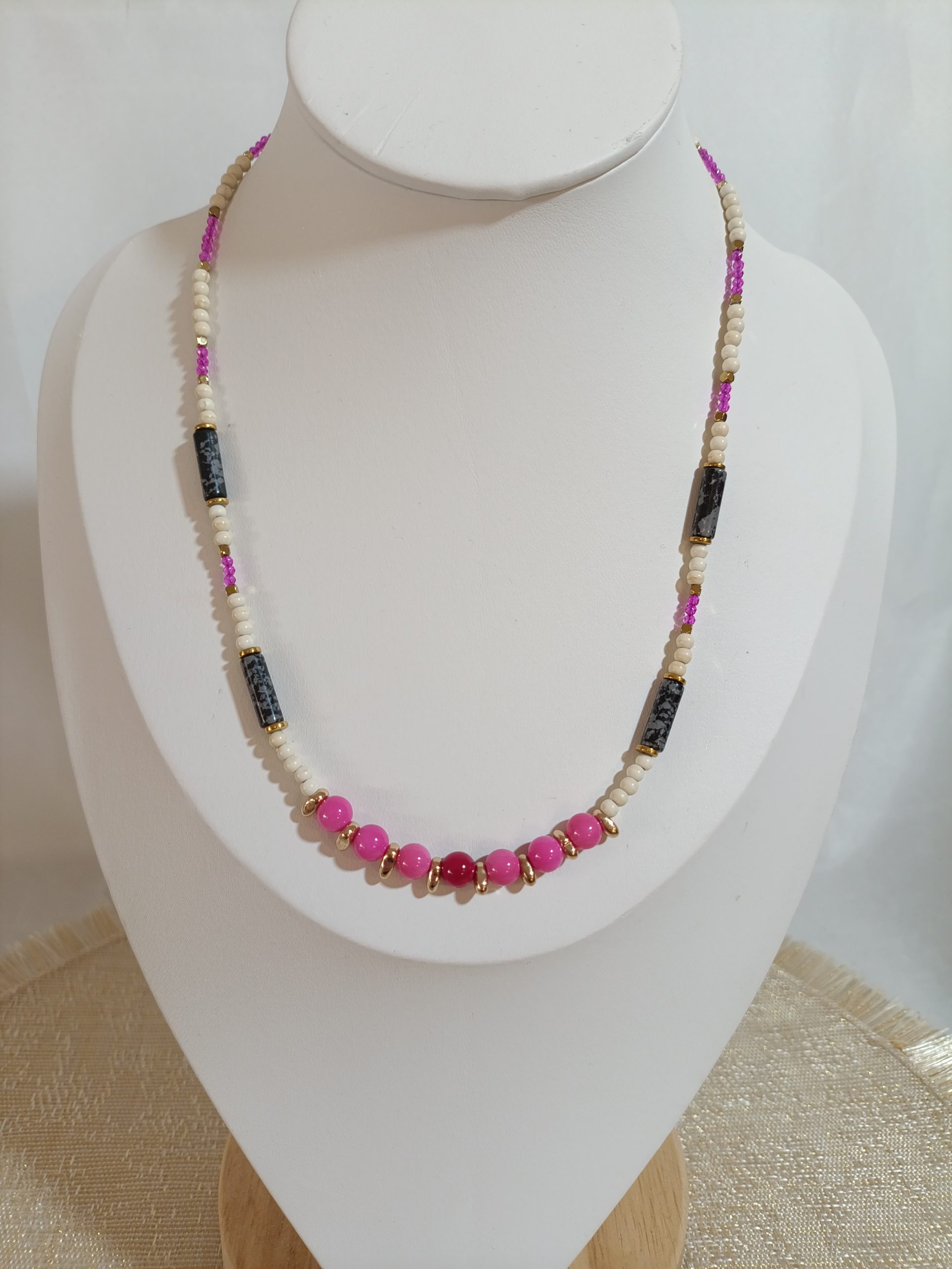 Ζωντανές ροζ και φούξια χάντρες δημιουργούν μια παιχνιδιάρικη και αισιόδοξη διάθεση. Το κολιέ αυτό ακτινοβολεί χαρά και φρεσκάδα. Ιδανικό για να προσθέσει χρώμα σε μια απλή εμφάνιση.