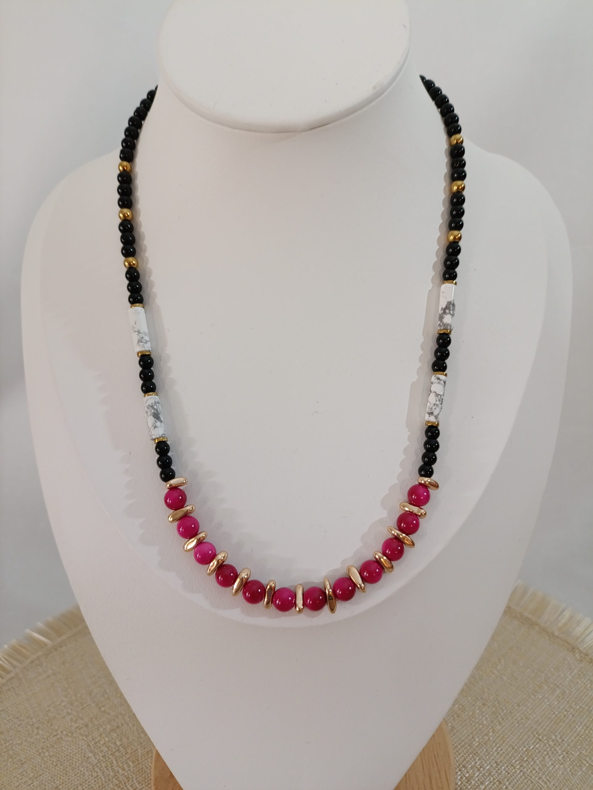 Λαμπερό κολιέ με φούξια χάντρες που αποπνέει θηλυκότητα και κομψότητα. Ιδανικό για καθημερινή χρήση αλλά και για βραδινές εμφανίσεις. Ένα διαχρονικό σχέδιο που προσθέτει ζωντάνια σε κάθε look.