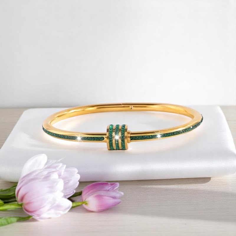 Το ”Zelene” είναι ένα statement βραχιόλι που αποπνέει κομψότητα και δύναμη. Χρυσή μεταλλική βάση που “αγκαλιάζει” λαμπερά πράσινα ζιρκόνια σε γεωμετρική διάταξη, δημιουργώντας την αίσθηση μιας τροχιάς γεμάτης φως και αυτοπεποίθηση. Ιδανικό για τις γυναίκες που δεν φοβούνται να ξεχωρίζουν.